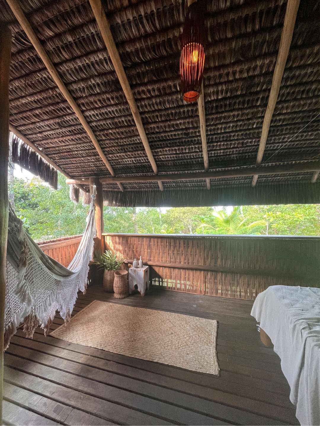 Localizada no piso superior, a varanda tem rede, cama extra e vista.